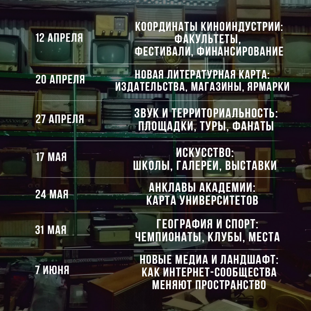 В рамках текущего сезона мы предлагаем — на примере конкретных кейсов — рассмотреть процесс создания и функционирования явлений, которые наполняют нашу культурную жизнь, в их непосредственной привязке к географии — локальным и повсеместным особенностям.