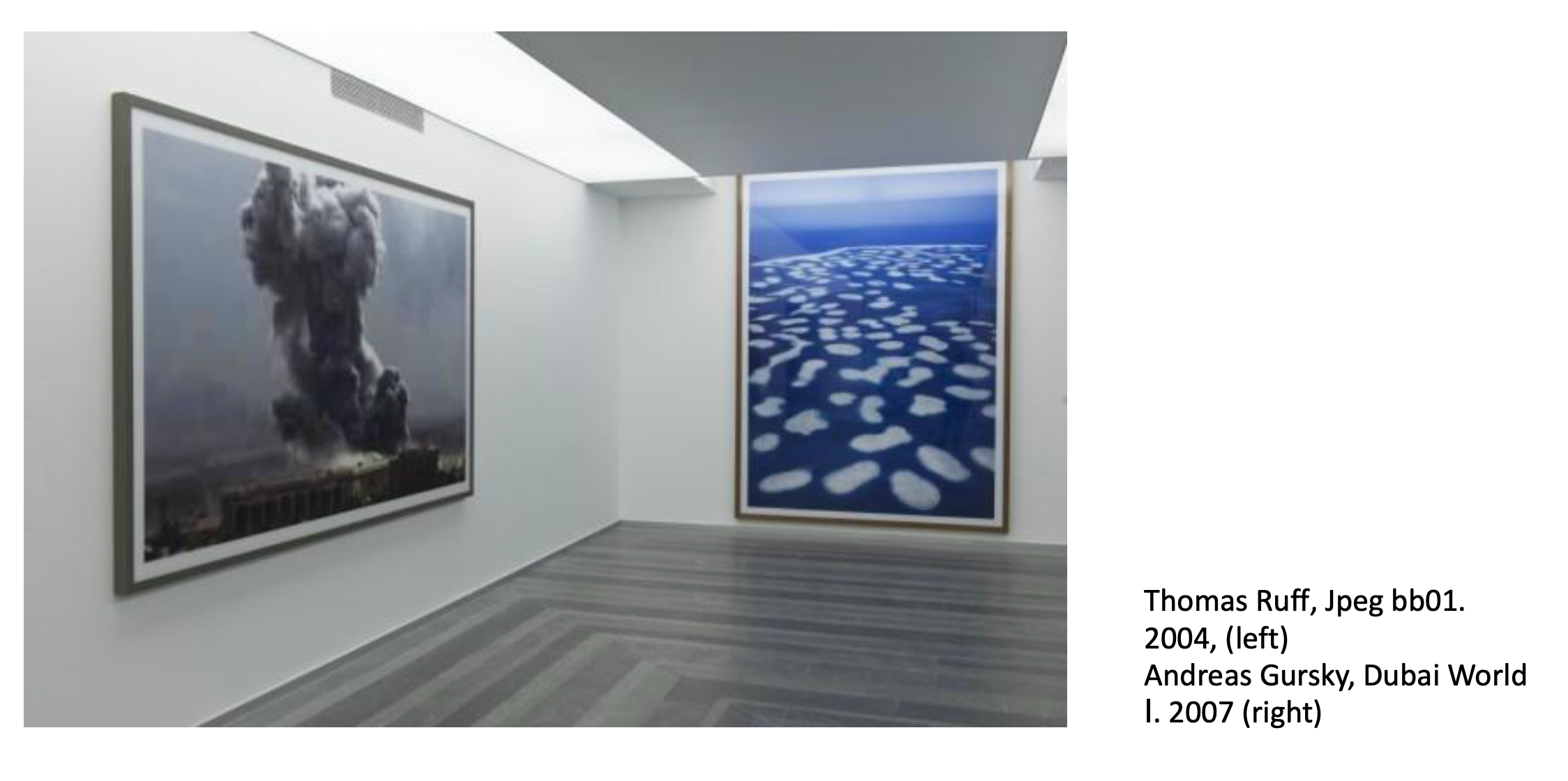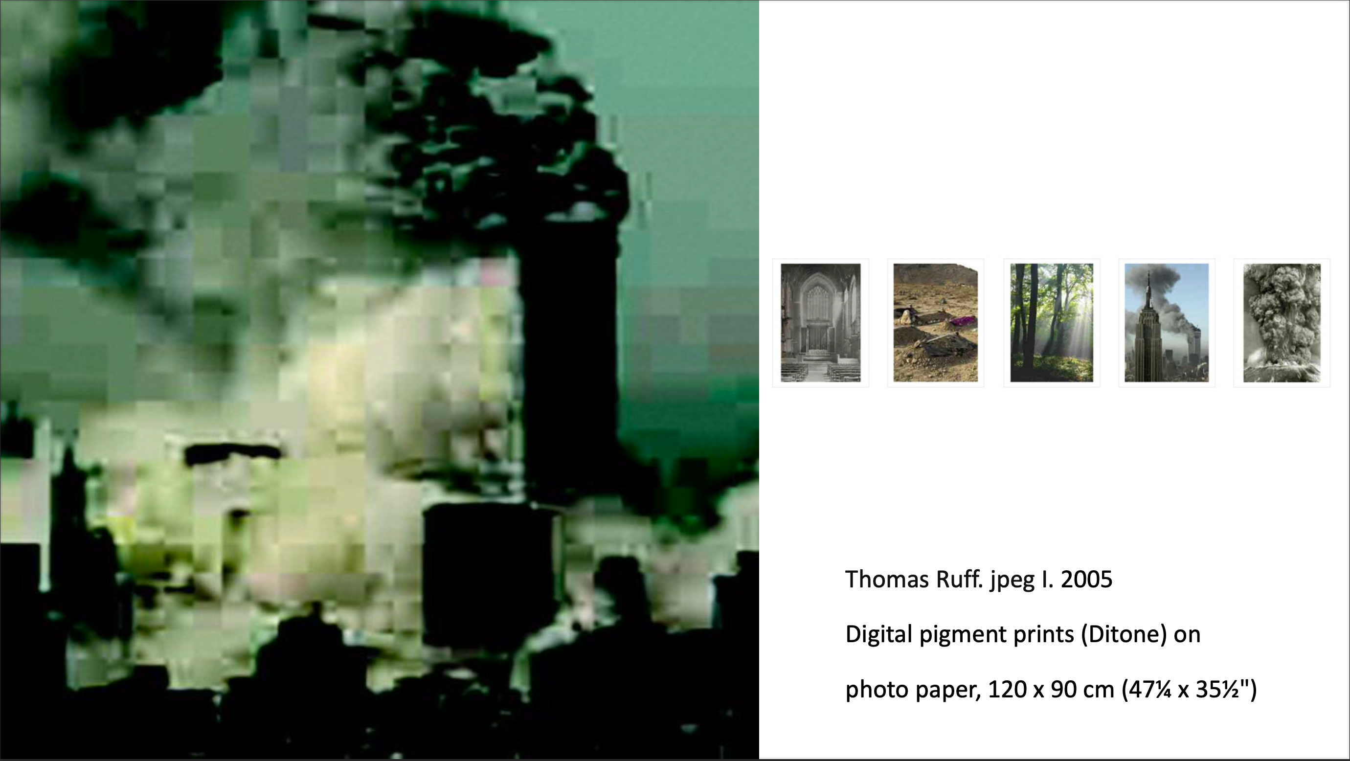 The theme of collective memory is directly related to "jpeg". This series has two sub-themes that I would define as "disaster" and "pastoral". He chose pictures of natural disasters (volcanic eruptions, floods), the war in the Middle East, ruins, and 9/11. For the other theme, he chose pictures with the opposite effect to the catastrophic images: jungle, forest, fields, and uncrowded city landscapes. A conversation about collective memory will relate mainly to the first theme because collective memory is mostly a memory of events. The most striking example that Ruff uses is, of course, the photos of the events of 9/11, which in many cases is the turning point for Western civilization. The memory of a large number of people (who have access to the benefits of the information age) contains the image of this tragedy, but it is blurred as a result of the horror of watching the catastrophe live. The fragmentation of Ruff’s pictures works the same way. It gives an idea of the general structure of the image but hides the details of the traumatic experience associated with it. Ruff’s manipulation of the image limits our access to the scenes depicted and thus reduces their aggressive nature. To some extent, this works as censorship.