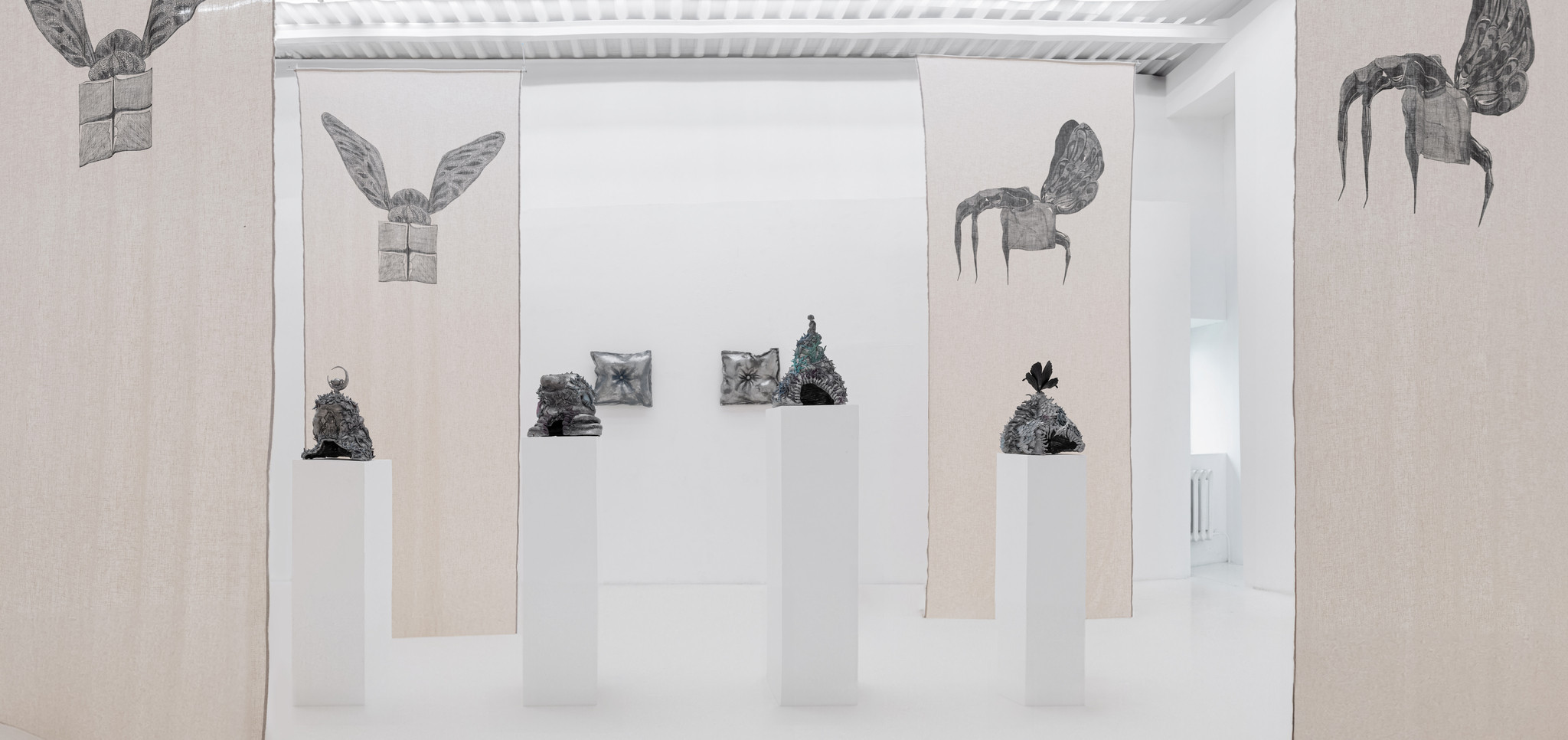 Живые организмы — втиснутые, вживленные, спрятанные в геометрические формы — обрамляют круглую зеркальную поверхность, то ли выползая из неё, то ли стремясь осознать себя, посредством отражения. В своих телах они содержат след перехода, гибридности, изменения. Взаимодействие с их структурой ещё нестабильно, не выверено, но уже проявлено в образах на флагах, как манифест их данности. Они словно приглашают зрителя к диалогу, коммуникации разбивая строгую геометричность зеркального круга.