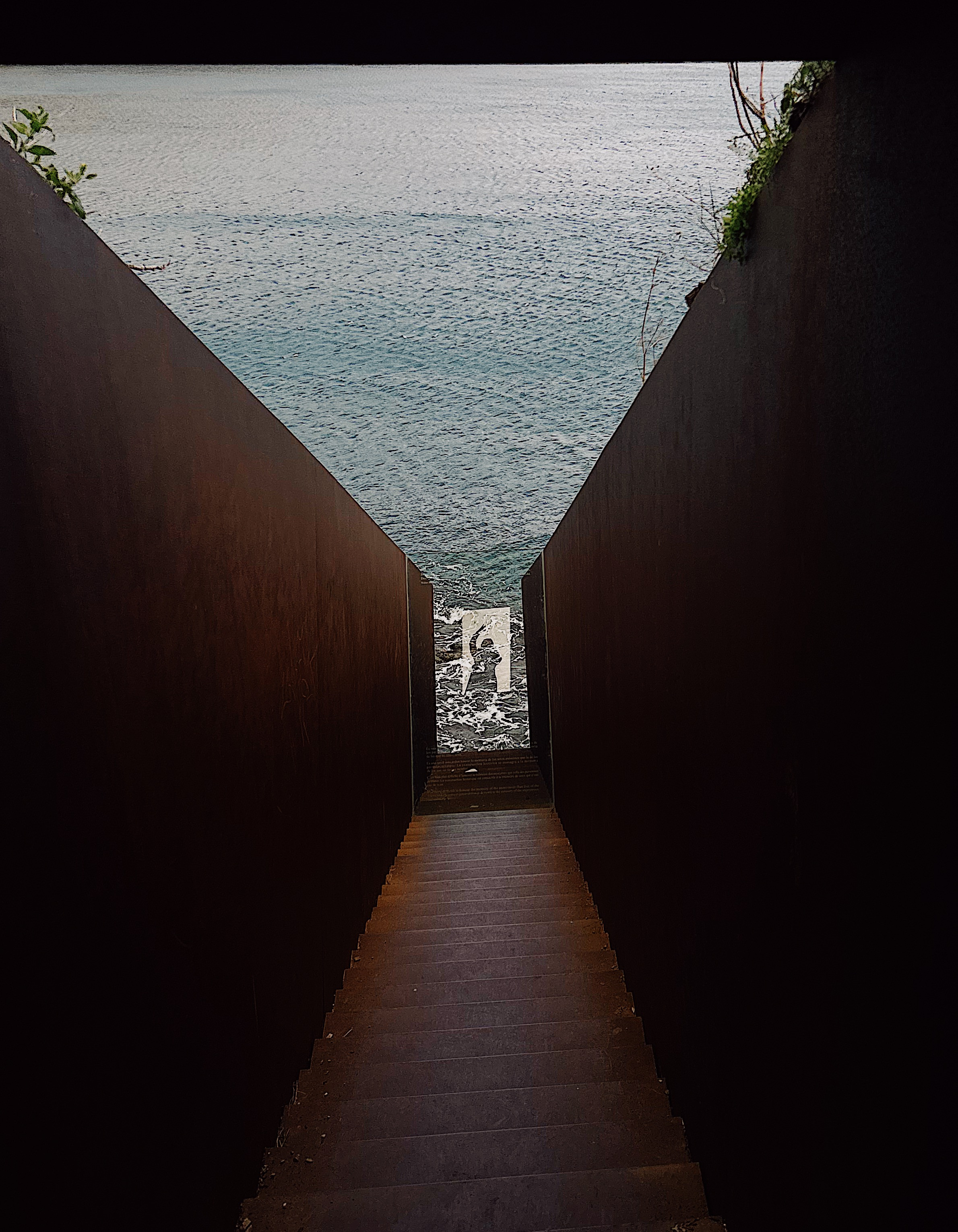 Сам мемориал без сомнения стоил и непростого спуска, и всей долгой дороги. Он задуман так, что его недостаточно сфотографировать или снять на видео, — его нужно пережить (и это переживание логично встраивается в опыт спуска по пиренейской тропе). Мемориал называется «Пассажи» — в честь недописанной книги Беньямина про французские пассажи, а само слово «пассаж» переводится как «переход». Переход, видимо, не только через государственную границу, но и через границу между жизнью и смертью (там не нужна транзитная виза). А переживаешь его буквально: спускаешься сквозь мемориал-коридор к морю, по ступенькам. Завершается спуск стеклянной стеной, сквозь стекло плещется море. На стекло нанесена цитата Беньямина: «Труднее чтить память безвестных, чем знаменитых. Течение истории освящено памятью безымянных».