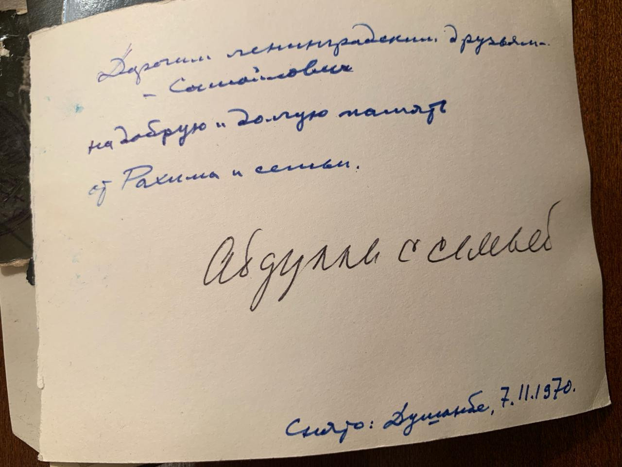 The first showed a man wearing a do’ppi, a traditional Central Asian skullcap, with his family beside him. The second depicted the same man sitting alone, with an inscription that read: «To my dear friend and brother Platon Alexandrovich, in memory of how we found each other again after forty-two years apart since our youth together. From Burkhanov Rahim Munzimovich. City of Dushanbe, April 27, 1968. The photo was taken on April 21, 1968».