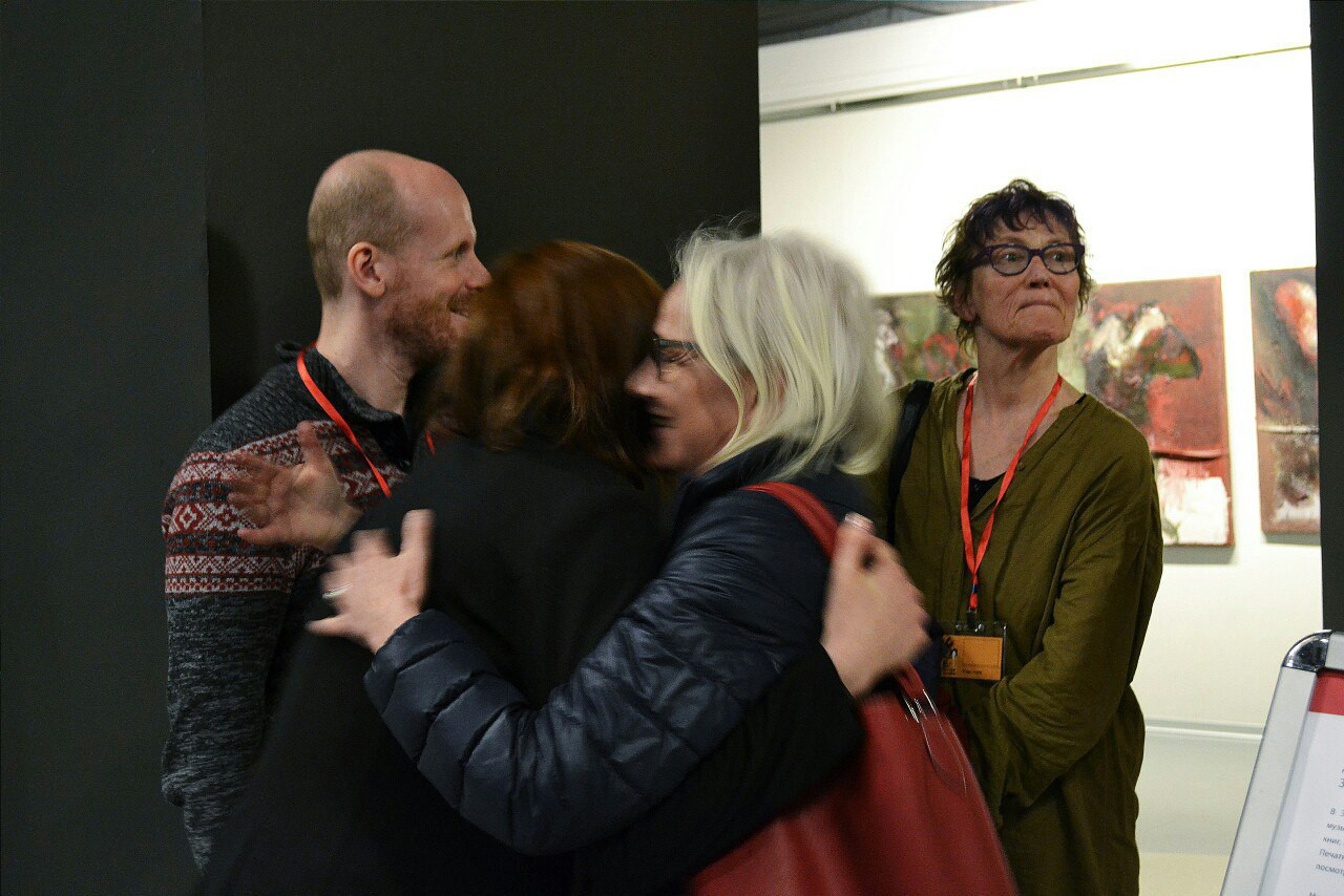фото автора: кураторы встречают знакомых гостей из Скандинавии на показе