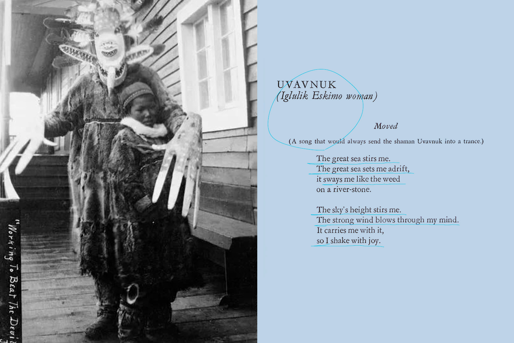 Эта поэзия частично состоит из упомянутых эзотерических образов, но только частично. Частично она неотличима от того, что мы привыкли называть лирикой: сугубо индивидуальным письмом для своих нужд, фиксацией опыта или связи, не редуцируемых до объяснений. Так, короткий текст, использующийся инуитским шаманом для введения себя в транс, может быть неотличим от хокку из японского травелога.