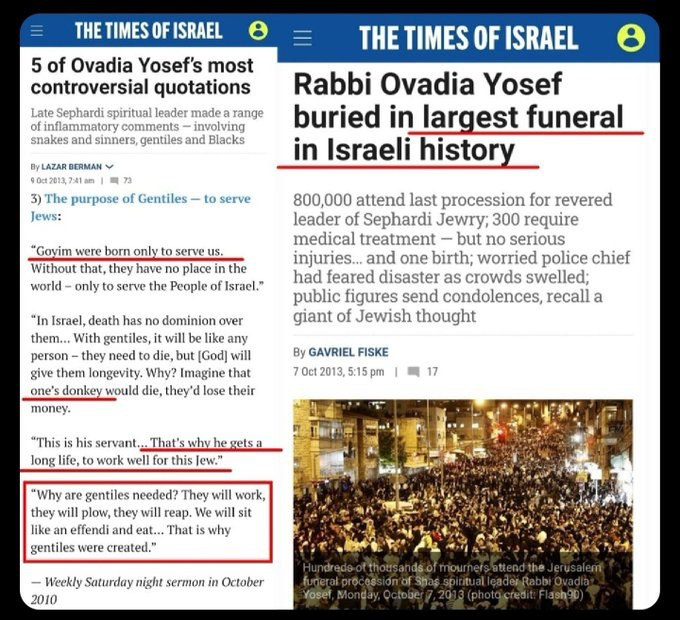 «Гои родились только для того, чтобы служить нам. Без этого им нет места в мире — только чтобы служить народу Израиля».