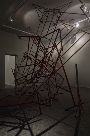 Конфигурация этой работы, выполненной с использованием фрулоресцентных ламп, отсылает к металлическим заграждениям, используемым в общественных местах и местах большого скопления людей.