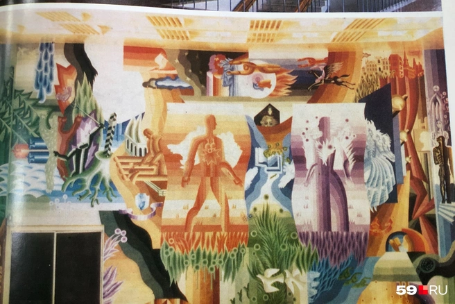 Но больше всего мне отозвалось кунгурское панно «Свидание», созданное для клуба кожевенно-обувной фабрики — города, где родилась моя мать. Витти назвал роспись «Свиданием» из-за слияния в городской черте рек Ирень и Сылва, которое он превратил во встречу мужчины и женщины: она — фиолетовая, полосатая, цветущая, он — красный, с мотором вместо сердца внутри грудной клетки. В сюжет Витти вписал профиль поэта-футуриста и авиатора Василия Каменского, чью книгу «Путь энтузиаста» он оформлял для пермского издательства.