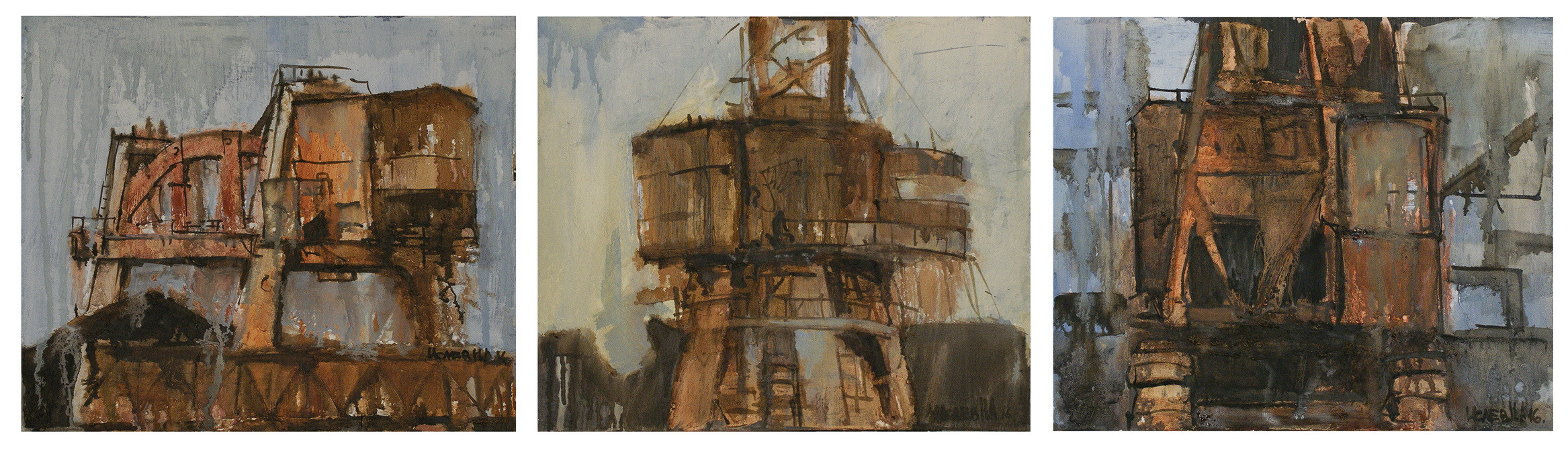 «Чистый» индустриальный пейзаж в триптихе «Юргинские виды» 2015 года (Рис. 3). Это монохромные виды небольшого промышленного города Юрга — дымящие трубы, портальные краны и линии проводов. Индустриальная эстетика, детали промышленных конструкций увлекают художника. Здесь изображена безрадостная обыденная реальность, которую мы видим каждый день. Автор передает со свойственной ей драматичностью психологический портрет времени.