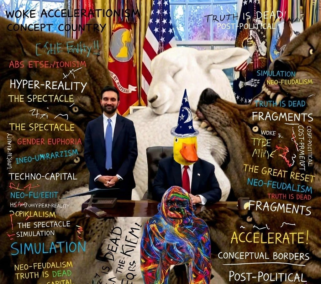 Инаугурация Дональда Трампа вдохновила множество мемов, которые приравнивали её не менее чем к пришествию зверя. Непреднамеренно зловещая фотография Трампа, саудовского короля Салмана и египетского президента Абдула Фаттаха ас-Сиси, касающихся загадочной светящейся сферы, первоначально опубликованная @SaudiEmbassyUSA, получила широкое распространение и вызвала сравнения со злодеями из «Властелина колец» и вселенной Marvel. Церковь Сатаны ретвитнула фотографию, уточнив, что это не сатанинский ритуал (международное движение сатанизма признан в РФ экстремистским и запрещено). Джон Ходжман отметил в своём ретвите теоретика заговора Алекса Джонса, прося его «обратить внимание», поскольку — подразумевалось — сфера явно собиралась запустить коммунистическо-рептилоидное возмездие. Не только альтернативные правые торгуют эстетикой цивилизационного упадка.