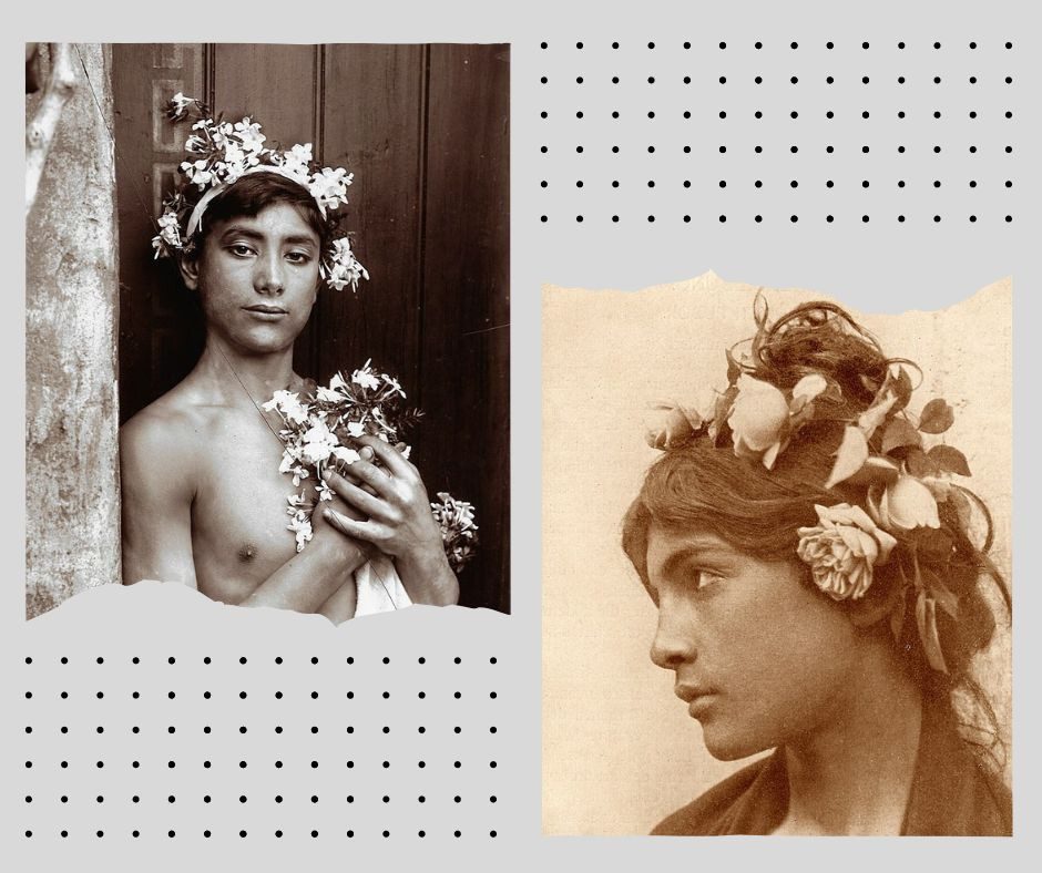 Греческие и римские одежды. На большей части фотографиях модели были обнажены, однако Глёден также любил наряжать юношей в античные одежды, шкуры, тоги и венки. Эти предметы придавали фотографиям возвышенности и наделяли сюжеты состоянием безвременья.