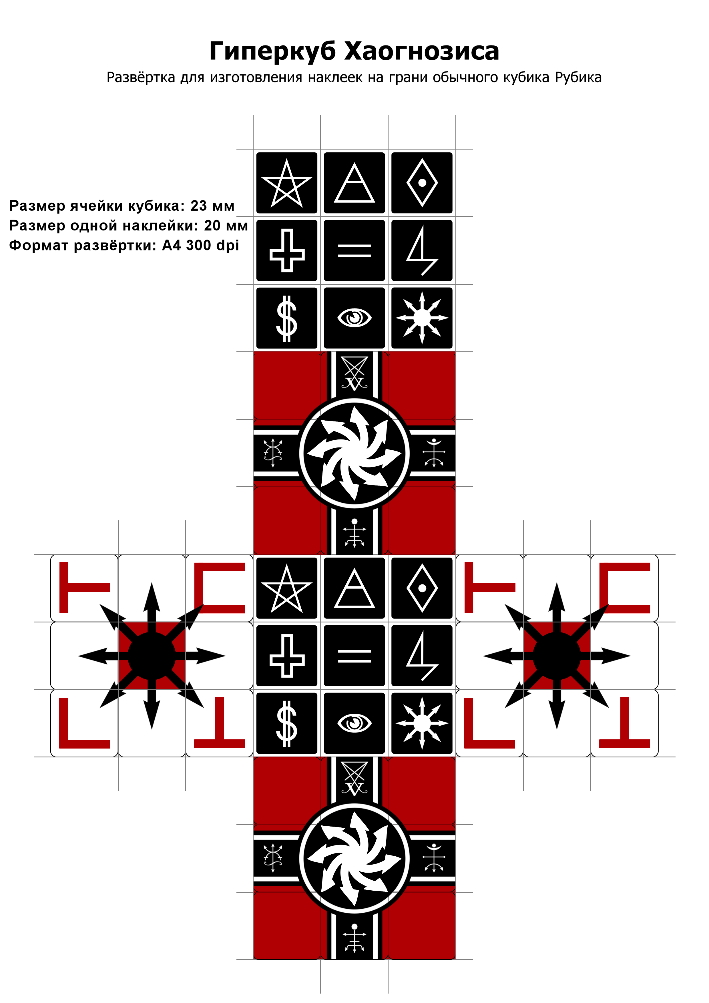 На развёртке представлены грани с красно-чёрно-белыми полосами и центральной спиралью (закрученной Звездой Хаоса).