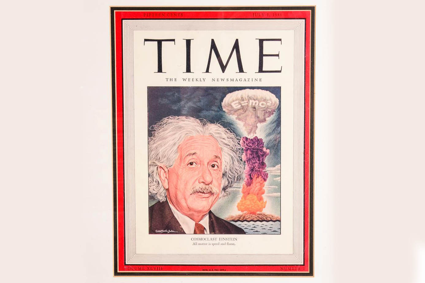 1 июля 1946 года журнал «Тайм» вышел с портретом Альберта Эйнштейна на обложке. За его спиной был изображён атомный «гриб», на фоне которого — его знаменитая формула E=mc². Под портретом красовалась подпись: «Эйнштейн — разрушитель миров». Тем не менее, на страницах журнала уточнялось: Эйнштейн не разрабатывал атомную бомбу непосредственно, хоть и может считаться её отцом по двум причинам: 1) американцы начали работу над ней по его совету; 2) его уравнение E=mc² теоретически обосновало возможность создания атомной бомбы. Согласно же расхожему мнению, Эйнштейн самолично создал атомную бомбу.